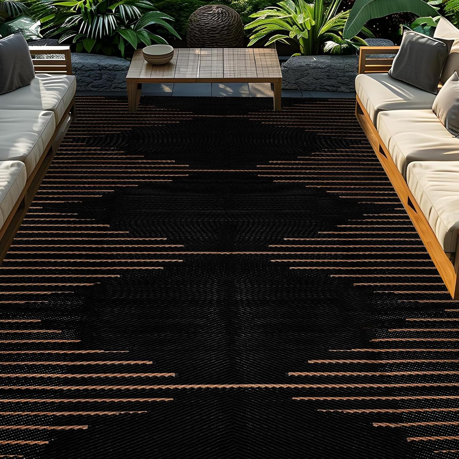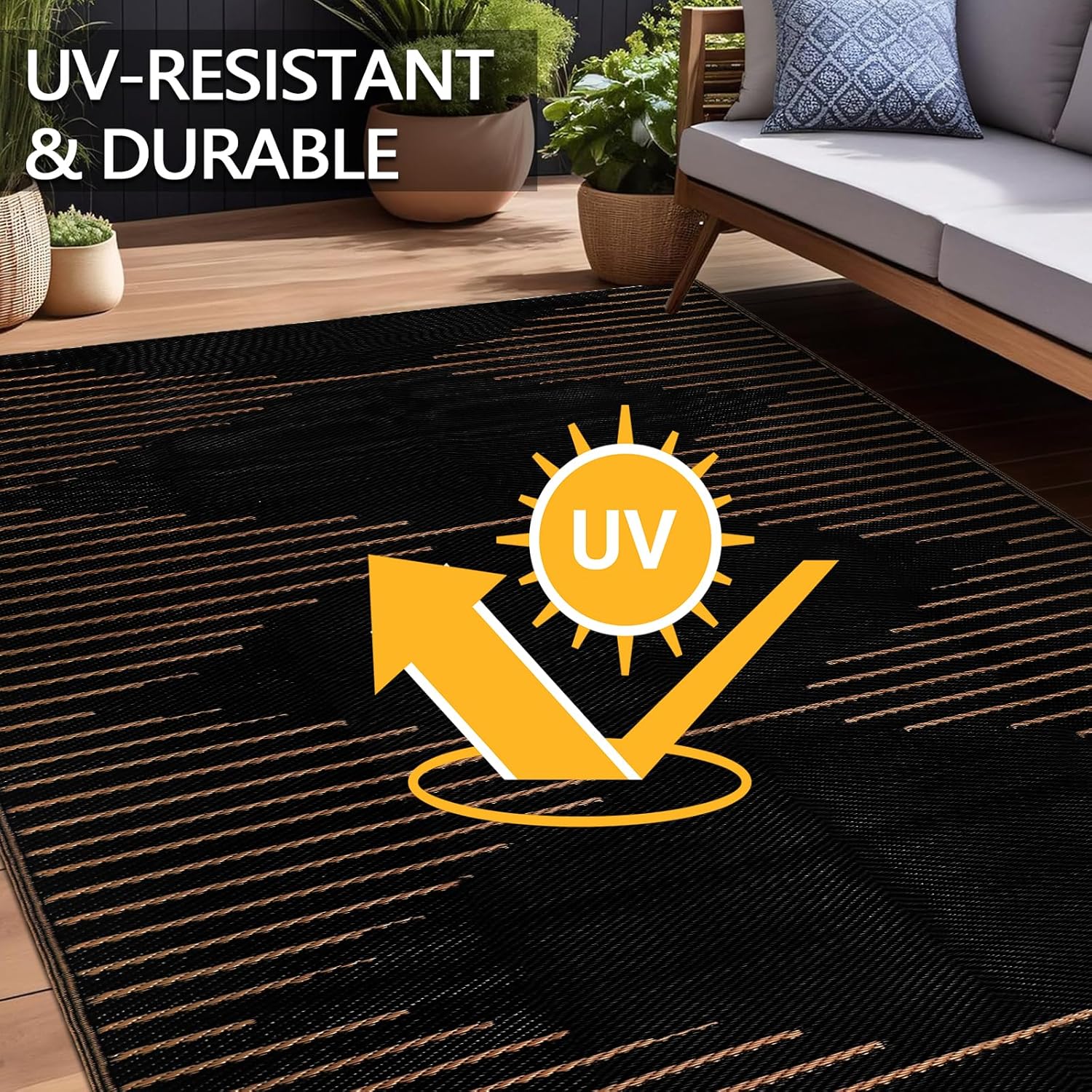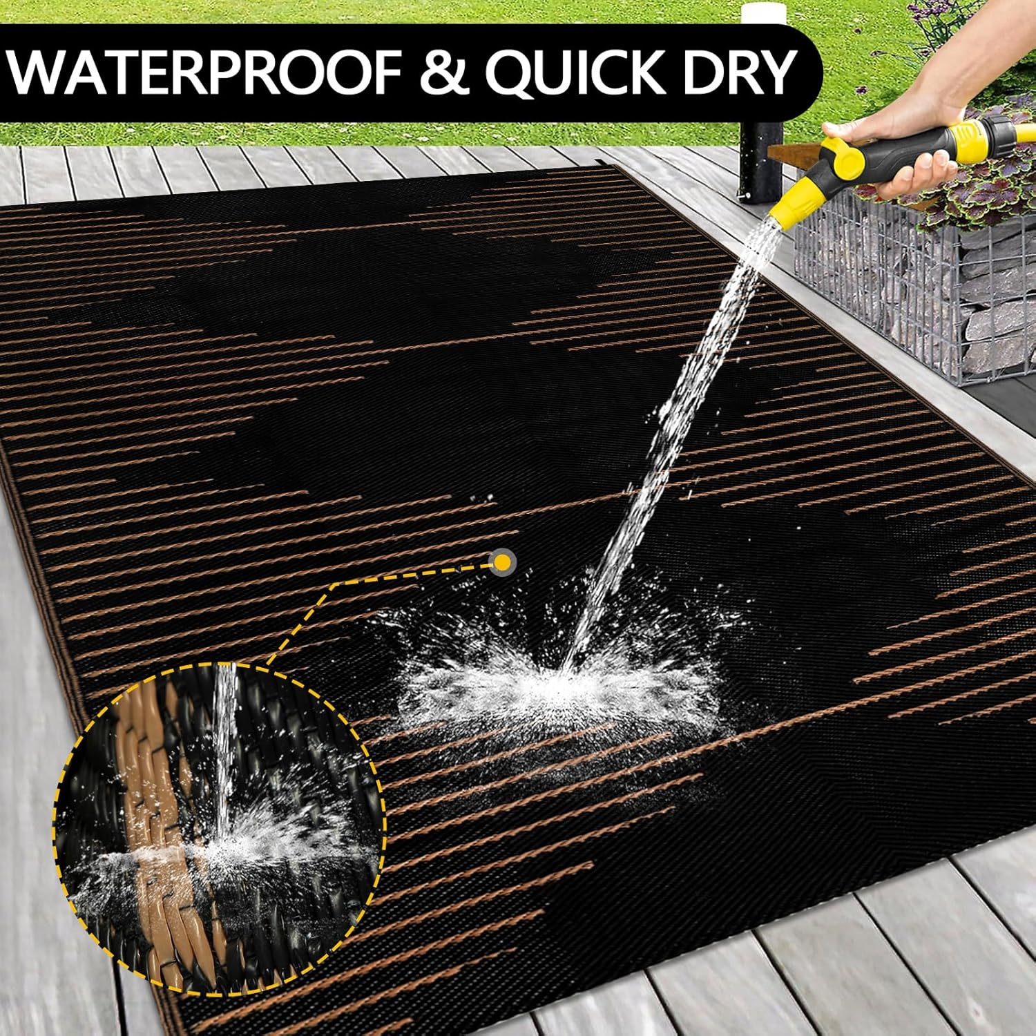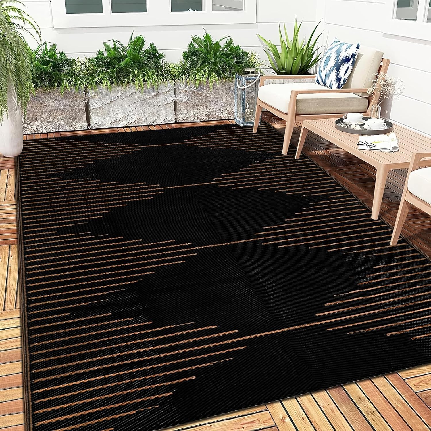 With its large size, this outdoor patio rug provides ample coverage and comfort underfoot. The reversible feature allows you to switch up the look of your outdoor space whenever you feel like a change. Plus, the waterproof material makes this rug easy to clean and maintain, ensuring that it stays looking fresh and new for years to come.